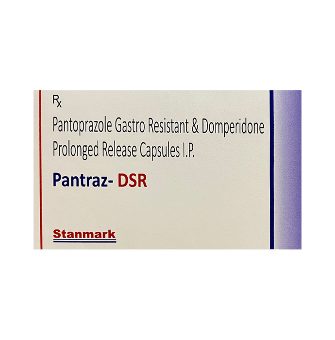 Pantraz-DSR Capsule is a prescription medicine used to treat gastroesophageal reflux disease (Acid reflux) and peptic ulcer disease by relieving the symptoms of acidity such as indigestion, heartburn, stomach pain, or irritation. Pantraz-DSR Capsule also neutralizes the acid in the stomach and promotes easy passage of gas to reduce stomach discomfort. It is taken without food in a dose and duration as advised by the doctor. The dose you are given will depend on your condition and how you respond to the medicine. You should keep taking this medicine for as long as your doctor recommends. If you stop treatment too early your symptoms may come back and your condition may worsen. Let your healthcare team know about all other medications you are taking as some may affect, or be affected by this medicine. The most common side effects are diarrhea, stomach pain, flatulence, dryness in the mouth, and headache. Most of these are temporary and usually resolve with time. Contact your doctor straight away if you are at all concerned about any of these side effects. This medicine may cause dizziness and sleepiness, so do not drive or do anything that requires mental focus until you know how this medicine affects you. Avoid drinking alcohol while taking this medicine as it can worsen your sleepiness. Lifestyle modifications like having cold milk and avoiding hot tea, coffee, spicy food, or chocolate can help you to get better results. Before you start taking this medicine it is important to inform your doctor if you are suffering from kidney or liver disease. You should also tell your doctor if you are pregnant, planning pregnancy, or breastfeeding.