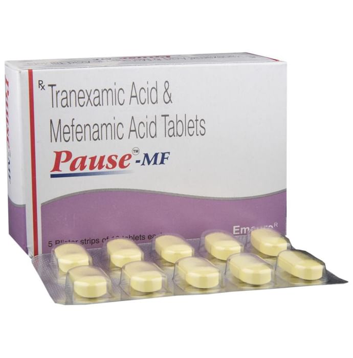 Pause-MF Tablet is a combination medicine used to treat heavy menstrual bleeding and menstrual pain. It prevents the breakdown of blood clots to control excessive bleeding during periods. It also blocks the production of certain chemical messengers that cause pain and inflammation. You can take Pause-MF Tablet at any time of day, with food, but it is best to take it at the same time each day. It should be taken on first day of the periods to get the most benefit. Keep taking it for as long as advised by your doctor. Take this medicine in the dose and duration advised by the doctor and if you have missed a dose, take it as soon as you remember. Remember to finish the full course of treatment even if you feel better. Inform your doctor if you do not observe any change in periods even after 3 consecutive periods. The most common side effects of this medicine include nausea, stomach pain, headache, nasal congestion, sinus pain, sinus inflammation, rash, tiredness, and musculoskeletal (bone, muscle or joint) pain. It may also cause diarrhea, so it is better to take plenty of fluids while taking this medicine as it may help to prevent dehydration. It is advised to consult with your doctor if you do not notice any changes in periods after 3 consecutive periods. Before taking it, let your doctor know if you have any kidney problems or vaginal bleeding disorder. Pregnant or breastfeeding women should also consult their doctor for advice before taking this medicine. You also need to tell your doctor what other medicines you are taking. You might be asked for eye check-ups while taking this medicine. It is advised to avoid alcohol while taking this medicine.