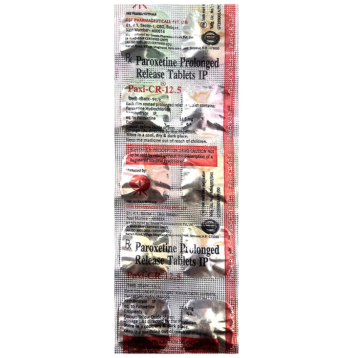 Paxi-CR 12.5 Tablet is a type of antidepressant belonging to the selective serotonin reuptake inhibitor (SSRI) group of medicines. It is widely prescribed to treat depression and anxiety-related conditions like obsessive-compulsive disorder, and panic disorder. Paxi-CR 12.5 Tablet helps many people to recover from depression by improving their mood and relieving anxiety and tension. It can be taken with or without food. The dose and how often you need it will be decided by your doctor so that you get the right amount to control your symptoms. Your doctor may start you on a lower dose and increase it gradually. Do not change the dose or stop taking it without talking to your doctor, even if you feel well. Doing so may make your condition worse or you may suffer from unpleasant withdrawal symptoms (anxiety, restlessness, palpitations, dizziness, sleep disturbances, etc). To get the most benefit, take this medicine regularly at the same time each day. Your doctor may advise you to take it in the morning if you have trouble sleeping. It may take a few weeks before you start feeling better. Let your doctor know if you do not see any improvement even after 4 weeks. Some common side effects of Paxi-CR 12.5 Tablet include nausea, fatigue, dry mouth, loss of appetite, increased sweating, dizziness, nervousness, tremors, insomnia (difficulty in sleeping), and constipation. Sexual side effects like decreased sexual drive, delayed ejaculation, and erectile dysfunction may also be seen. Let your doctor know straight away if you develop any sudden worsening of mood or any thoughts about harming yourself. Before taking this medicine, you should tell your doctor if you have epilepsy (seizure disorder or fits), diabetes, liver or kidney disease, heart problems, or glaucoma. These may affect your treatment. Pregnant or breastfeeding women should also consult their doctor before taking it. Some other medicines may affect the way it works, especially other antidepressants and medicines called MAO inhibitors. Please tell your doctor about all the medicines you are taking to make sure you are safe.