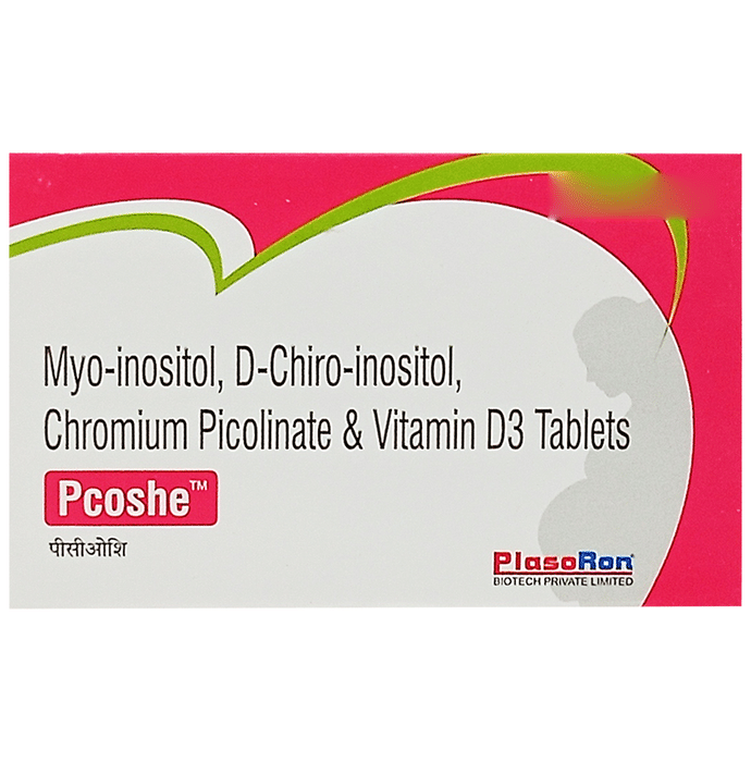 Pcoshe Tablet is used to treat polycystic ovarian syndrome (PCOS). It helps to correct menstrual cycle and hormonal imbalance in the body to achieve ovulation. It promotes weight loss by improving metabolism and also regulates the level of calcium in the body to keep the bones strong. It is advised to take Pcoshe Tablet at a fixed time each day to maintain consistent levels of medicine in the blood. In case you have missed any doses, take it as soon as you remember it. Never skip any doses and finish a full course of treatment even if you feel better. It is important that this medication is not stopped suddenly without talking to the doctor as it may worsen your symptoms. Some common side effects of this medicine include rash, nausea, paresthesia (tingling or pricking sensation), postural hypotension (low blood pressure) and dizziness. If these bother you or appear serious, let your doctor know. There may be ways of reducing or preventing them. Before taking medicine, tell your doctor if you are breastfeeding, if you have ever had any problem of vaginal bleeding or liver or thyroid problem. Your doctor should also know about all other medicines you are taking as many of these may make this medicine less effective or change the way it works.