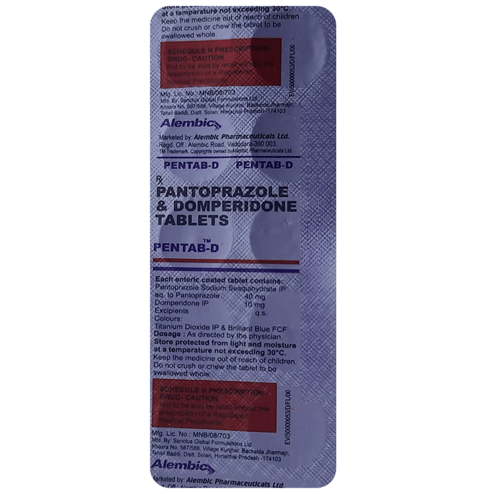 In Treatment of Gastroesophageal reflux disease (Acid reflux) Gastroesophageal reflux disease (GERD) is a chronic (long-term) condition in which there is an excess production of acid in the stomach. Pentab-D Tablet reduces the amount of acid your stomach makes and relieves the pain associated with heartburn and acid reflux. You should take it exactly as it is prescribed for it to be effective. Some simple lifestyle changes can help reduce the symptoms of GERD. Think about what foods trigger heartburn and try to avoid them; eat smaller, more frequent meals; try to lose weight if you are overweight, and try to find ways to relax. Do not eat within 3-4 hours of going to bed. In Treatment of Peptic ulcer disease Peptic ulcer disease is a condition in which painful sores or ulcers develop in the inner lining of the stomach or gut (intestine). Pentab-D Tablet reduces the amount of acid your stomach makes which prevents further damage to the ulcer as it heals naturally. You may be given other medicines along with this medicine depending on what caused the ulcer. You need to keep taking the medicine as it is prescribed for it to be effective, even if the symptoms seem to disappear.