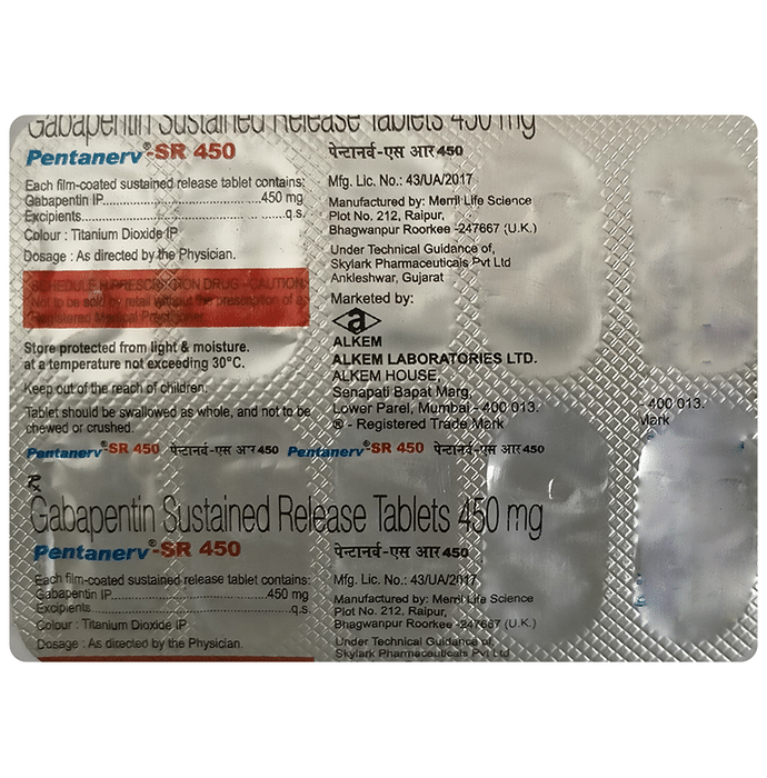 Pentanerv 450mg Tablet SR is a medicine used to relieve the pain caused by nerve damage (neuropathic pain) due to various conditions like diabetes, shingles (herpes zoster infection), spinal cord injury, etc. It is also used to treat certain types of seizures (fits) in combination with other medicines. Pentanerv 450mg Tablet SR belongs to the anti-epileptic group of medicines. You may take it with or without food, but it is important to take this medicine at the same time each day to get the most benefit. The exact dose and duration of treatment will depend on your condition and how you respond to it. Your doctor will probably start this medicine at a low dose and increase it gradually. It may take a few weeks for the medicine to work properly. Follow your doctor’s instructions and continue taking it regularly until your doctor advises you to stop. Do not miss any dose, otherwise, your condition may worsen. Most people taking Pentanerv 450mg Tablet SR do not experience any side effects. The most common ones are feeling sleepy, dizzy, or tired (fatigue). These are usually mild and go away by themselves as your body gets used to the medicine. Most side effects are not serious and do not need medical attention. Talk to your doctor if any of the side effects persist or worry you. You should avoid drinking alcohol along with this medicine as it may lead to excessive sleepiness and dizziness. Let your doctor know right away if you develop any unusual mood changes like anxiety, agitation, depression, or thoughts about harming yourself. Before taking Pentanerv 450mg Tablet SR, you should tell your doctor if you have any kidney-related problems or if you are more than 65 years old. Your doctor may prescribe a different dose in such people. Women who are pregnant, breastfeeding, or planning to become pregnant should also consult their doctor before using this medicine.