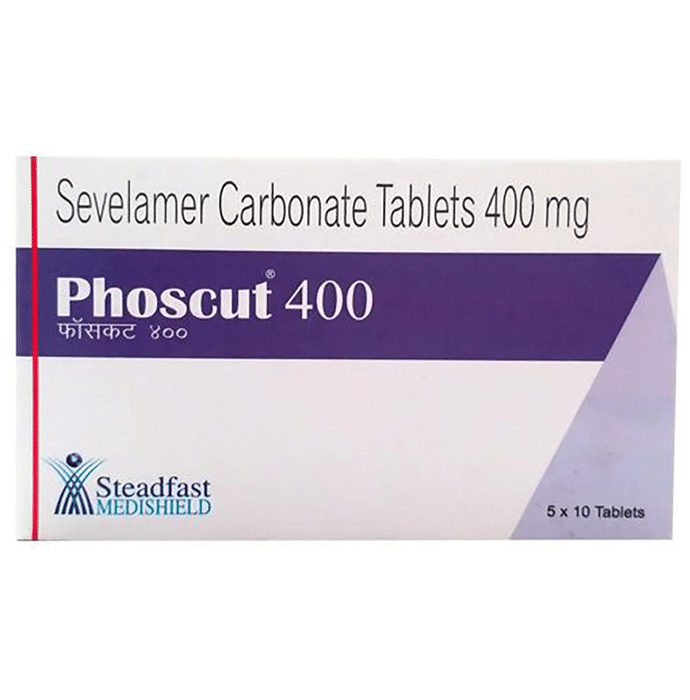 In High phosphate levels in blood Our body needs phosphate for various life functions such as strengthening of bones and teeth, production of energy, and forming outer layers of cells in our body called the cell membrane. But too much phosphate in our blood can cause serious complications such as heart attack, stroke as well as kidney damage. Phoscut 400 Tablet helps to lower the phosphate levels in our blood and prevents these complications particularly in patients who are on dialysis and are unable to get rid of excess phosphate levels through kidneys. Take Phoscut 400 Tablet as prescribed by the doctor to get the most of this medicine.