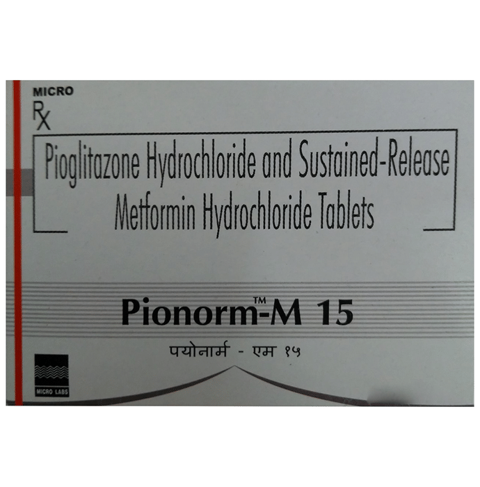 Pionorm-M 15 Tablet SR is a combination medicine that helps control blood sugar levels. This medicine is used together with diet and exercise to improve blood sugar control in adults with type 2 diabetes mellitus. It helps in proper utilisation of insulin, thereby lowering the blood sugar level. Pionorm-M 15 Tablet SR should be taken in the dose and duration as advised by your doctor. It must be taken with food to avoid stomach upset. If you miss a dose, take it as soon as possible. However, if it is almost time for your next dose, skip the missed dose and go back to your regular schedule. Do not double the dose. Overdose may lead to low blood sugar (hypoglycemia). Some people may develop common side effects like nausea, loss of appetite, taste changes, stomach pain, diarrhea, edema (swelling) and blurred vision. However, these are usually not bothersome. If these do not resolve or worry you, please consult your doctor. Before taking this medicine, inform your doctor if you have any kidney, liver or heart problems. Pregnant or breastfeeding women should also consult their doctor before taking it. Your doctor will check your kidney function tests before starting treatment with it. Avoid excessive alcohol intake while taking it as this may increase the risk of developing some side effects.