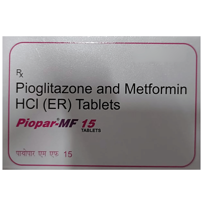 Piopar-MF 15 Tablet ER is a combination medicine that helps control blood sugar levels. This medicine is used together with diet and exercise to improve blood sugar control in adults with type 2 diabetes mellitus. It helps in proper utilisation of insulin, thereby lowering the blood sugar level. Piopar-MF 15 Tablet ER should be taken in the dose and duration as advised by your doctor. It must be taken with food to avoid stomach upset. If you miss a dose, take it as soon as possible. However, if it is almost time for your next dose, skip the missed dose and go back to your regular schedule. Do not double the dose. Overdose may lead to low blood sugar (hypoglycemia). Some people may develop common side effects like nausea, loss of appetite, taste changes, stomach pain, diarrhea, edema (swelling) and blurred vision. However, these are usually not bothersome. If these do not resolve or worry you, please consult your doctor. Before taking this medicine, inform your doctor if you have any kidney, liver or heart problems. Pregnant or breastfeeding women should also consult their doctor before taking it. Your doctor will check your kidney function tests before starting treatment with it. Avoid excessive alcohol intake while taking it as this may increase the risk of developing some side effects.