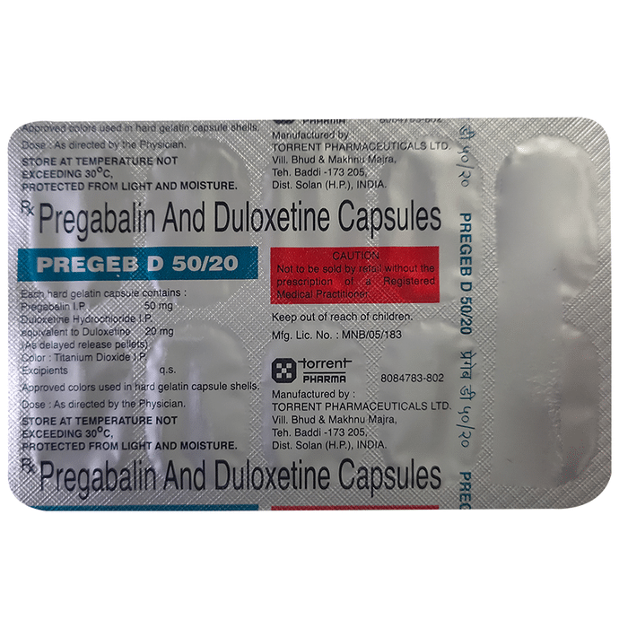 Pregeb D 50/20 Capsule is used for the treatment of neuropathic pain. It decreases pain by controlling calcium channel activity of the nerve cells. It also increases the level of chemical messengers in the brain that helps maintain mental balance and stop the movement of pain signals in the brain. Pregeb D 50/20 Capsule can be taken with or without food. However, it is advised to take it at the same time each day as this helps to maintain a consistent level of medicine in the body. Take this medicine in the dose and duration advised by your doctor as this is habit forming medicine. If you miss a dose of this medicine, take it as soon as you remember. Finish the full course of the treatment even if you feel better. It is important not to stop taking this medicine suddenly as it may worsen your symptoms. Some common side effects of this medicine include peripheral edema, nausea, headache, dryness of mouth, difficulty in concentration and blurred vision. It may cause dizziness and sleepiness, so do not drive or do anything that requires mental focus until you know how this medicine affects you. This medicine may cause weight gain and to control it, you should have a balanced diet and exercise regularly. It is important to inform your doctor if you develop any unusual changes in mood or behavior, new or worsening depression, or suicidal thoughts. Before taking this medicine let your doctor know if you suffer from kidney or liver disease. Your doctor should also know about all other medicines you are taking as many of these may make this medicine less effective or change the way it works. Inform your doctor if you are pregnant, planning pregnancy or breastfeeding.