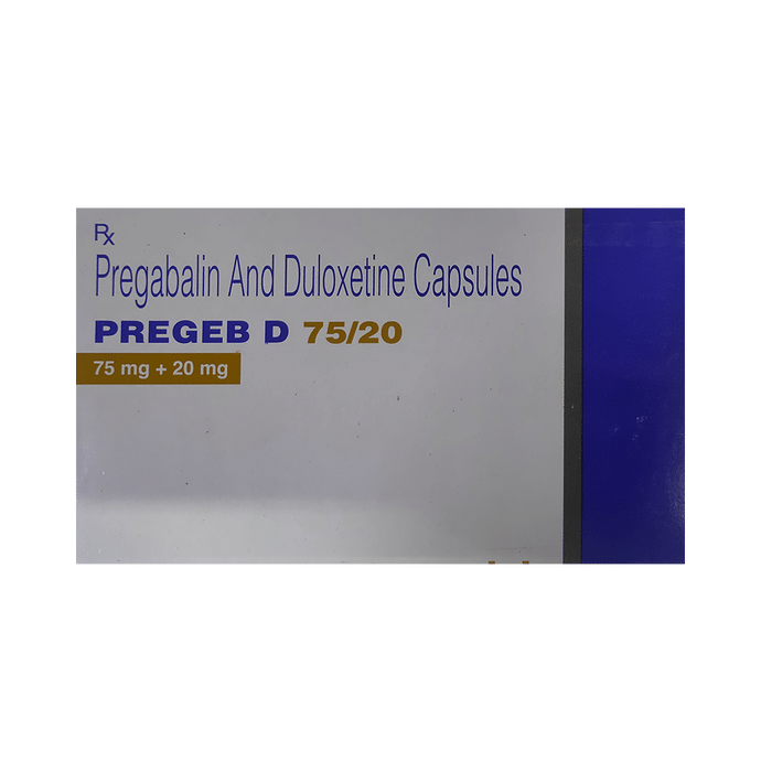 Pregeb D 75/20 Capsule is used for the treatment of neuropathic pain. It decreases pain by controlling calcium channel activity of the nerve cells. It also increases the level of chemical messengers in the brain that helps maintain mental balance and stop the movement of pain signals in the brain. Pregeb D 75/20 Capsule can be taken with or without food. However, it is advised to take it at the same time each day as this helps to maintain a consistent level of medicine in the body. Take this medicine in the dose and duration advised by your doctor as this is habit forming medicine. If you miss a dose of this medicine, take it as soon as you remember. Finish the full course of the treatment even if you feel better. It is important not to stop taking this medicine suddenly as it may worsen your symptoms. Some common side effects of this medicine include peripheral edema, nausea, headache, dryness of mouth, difficulty in concentration and blurred vision. It may cause dizziness and sleepiness, so do not drive or do anything that requires mental focus until you know how this medicine affects you. This medicine may cause weight gain and to control it, you should have a balanced diet and exercise regularly. It is important to inform your doctor if you develop any unusual changes in mood or behavior, new or worsening depression, or suicidal thoughts. Before taking this medicine let your doctor know if you suffer from kidney or liver disease. Your doctor should also know about all other medicines you are taking as many of these may make this medicine less effective or change the way it works. Inform your doctor if you are pregnant, planning pregnancy or breastfeeding.