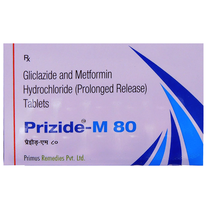 Prizide-M 80 Tablet belongs to a category of medicines known as anti-diabetic drugs. It is a combination of two medicines used to treat type 2 diabetes mellitus in adults. It helps control blood sugar levels in people with diabetes. Prizide-M 80 Tablet should be taken with food. Take it regularly at the same time each day to get the most benefit. Your doctor will decide what dose is best for you and this may change from time to time according to how it is working according to your blood sugar levels. Keep taking this medicine, even if you feel well or your blood sugar levels are controlled. If you stop it without consulting your doctor, your blood sugar levels could rise and put you at risk of kidney damage, blindness, nerve problems and loss of limbs. Remember that it is only part of a treatment program that should also include a healthy diet, regular exercise, and weight reduction as advised by your doctor. Your lifestyle plays a big part in controlling diabetes. The most common side effect of Prizide-M 80 Tablet is low blood glucose levels (hypoglycemia). Make sure you recognize the signs of having low blood glucose levels, such as sweating, dizziness, headache, and shaking and know how to deal with it. To prevent this, it's important to have regular meals and always carry a fast-acting source of glucose such as sugary food or fruit juice with you. Drinking alcohol can also increase your risk of low blood sugar levels and should be avoided. Other side effects that may be seen on taking this medicine include taste changes, nausea, diarrhea, stomach pain, headache, and upper respiratory tract infection. Some people may find that they put on weight with this medicine. You should not take it if you have type 1 diabetes mellitus, if you have diabetic ketoacidosis (high levels of acid in your blood), or if you have severe kidney or liver disease. Before taking this medicine, tell your doctor if you have ever had heart disease. It may not be suitable. Pregnant or breastfeeding women should also consult their doctor before taking it. Your blood sugar levels should be checked regularly and your doctor may also advise blood tests to monitor your blood cell counts and liver function.