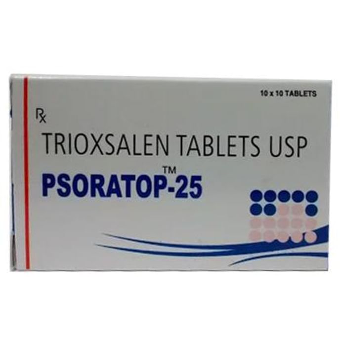 Psoratop 25mg Tablet is a medicine used in the treatment of vitiligo and psoriasis. It reduces the overproduction of skin cells and helps to re-pigment the discolored, white patches. Psoratop 25mg Tablet is taken after meals in a dose and duration as advised by the doctor. Taking with food helps to increase absorption of the medication as well as decrease nausea. The dose you are given will depend on your condition and how you respond to the medicine. You should keep taking this medicine for as long as your doctor recommends. If you stop treatment too early your symptoms may come back and your condition may worsen. Let your doctor know about all other medications you are taking as some may affect, or be affected by this medicine. The most common side effects of Psoratop 25mg Tablet are nausea, itching, and redness of the skin. Most of these are temporary and usually resolve with time. Contact your doctor straight away if you are at all concerned about any of these side effects. Taking this medicine makes the skin more sensitive to the sun. Use sunscreen and wear protective clothing when outdoors. Try to avoid exposure of your skin and lips to sunlight for eight hours after treatment. It is not recommended for children under the age of 14 years. Avoid eating certain foods like limes, figs, parsley, parsnips, mustard, carrots, and celery, as they may increase skin's sensitivity to light.
