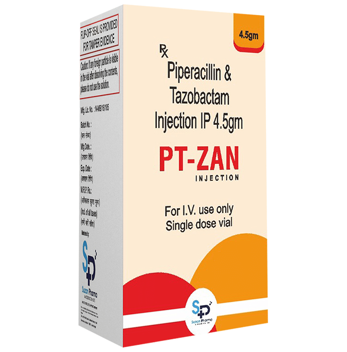 PT-Zan Injection is a combination of two antibiotics. It is used to treat various types of bacterial infections. It fights against the infection by killing the microorganisms. PT-Zan Injection is generally administered by a healthcare professional and should not be self-administered. Depending on the severity of your underlying illness, your doctor will decide the precise dose and schedule as per which this injection is to be given. It is strictly advised to be used as per the doctor’s prescription. Some of the common side effects of this medicine include nausea, vomiting, diarrhea, and rash. Additionally, you may notice some injection site reactions like pain, swelling, or redness. You should consult your doctor if these side effects do not get better with tdime and persist for a longer duration. Before using the medicine, you should tell your doctor if you are allergic to any antibiotics or have any kidney or liver problems. Your doctor may change the dose or prescribe a different medicine. This medicine is generally considered safe to use during pregnancy and breastfeeding if used under a doctor’s supervision.