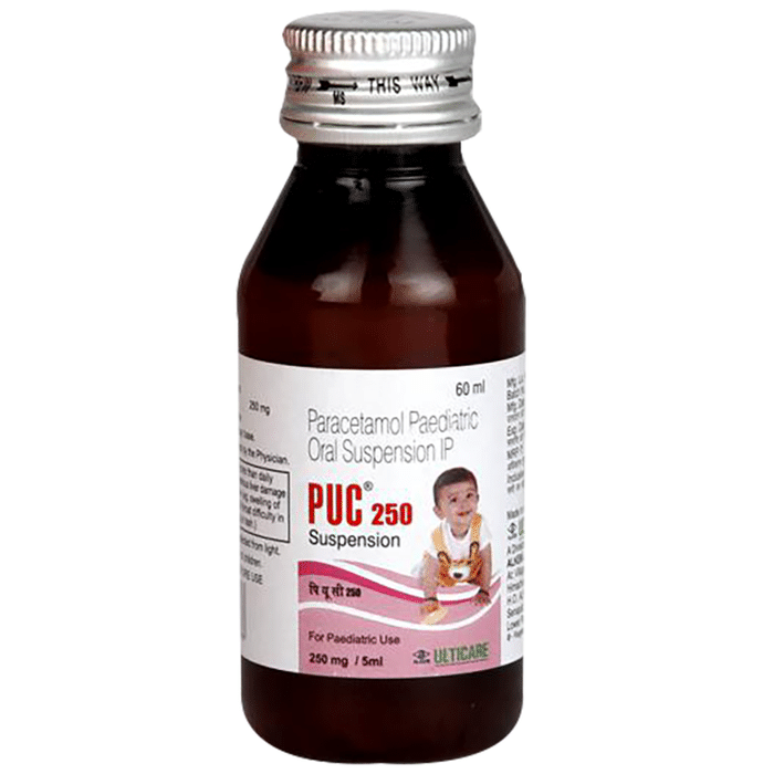 In Pain relief PUC 250mg/5ml Suspension is a common painkiller used to treat aches and pains. It works by blocking chemical messengers in the brain that tell us we have pain. It is effective in relieving pain caused by headache, migraine, nerve pain, toothache, sore throat, period (menstrual) pains, arthritis, and muscle aches. This medicine is very widely used and very rarely causes side effects if taken at the right dosage. Take it as it is prescribed to get the most benefit. Do not take more or for longer than needed as that can be dangerous. In general, you should take the lowest dose that works, for the shortest possible time. It is also the first choice of painkiller during pregnancy or breastfeeding. In Treatment of Fever PUC 250mg/5ml Suspension is also used to reduce a high temperature (fever). It works by blocking the release of certain chemical messengers that cause fever. It may be prescribed alone or in combination with another medicine. You should take it regularly as advised by your doctor.