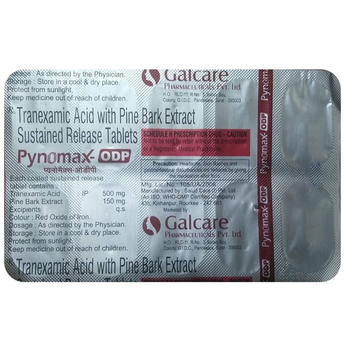 Pynomax ODP 500mg/150mg Tablet is a prescription medicine having combination of medicines that is used to stop bleeding. It controls excessive bleeding at the time of heavy flow in periods or after surgery. Pynomax ODP 500mg/150mg Tablet should be used in the dose and duration as advised by the doctor. Check the label before use. Do not take this medicine more than the recommended dose. This medicine can be taken with or without food. However, it is better to take this medicine at a fixed time. Inform your doctor if you are taking any medicine or have any known allergy from this medicine. The common side effects of this medicine include headache, sinus infection, back pain, abdominal pain or fatigue. If you experience any of these symptoms or any other symptoms which you think are because of this medicine for a longer duration, please consult your doctor. Inform your doctor if you are pregnant or breastfeeding or suffering from any other disease. It is not advised to take alcohol while taking this medicine.