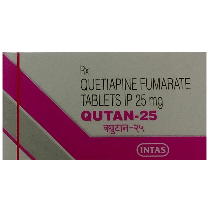 Qutan 25 Tablet is used in the treatment of schizophrenia (a mental disorder that can result in hallucinations or delusions and also adversely affects a person’s ability to think and behave) and mania. It is also used to treat bipolar disorders. Qutan 25 Tablet may be taken with or without food. However, it is advised to take it at the same time each day as this helps to maintain a consistent level of medicine in the body. Take this in the dose and duration as advised by your doctor and if you have missed a dose, take it as soon as you remember. It is important that this medication is not stopped suddenly without talking to your doctor as it may worsen your symptoms. However, discontinue this medicine immediately if you experience Neuroleptic malignant syndrome (NMS), characterized by fever, muscle rigidity, and altered consciousness or seizures. Some common side effects of this medicine include decreased hemoglobin levels in the blood, increased triglycerides level in blood, decreased cholesterol level in blood, headache, extrapyramidal symptoms, dry mouth, and withdrawal symptoms. Initially, this medicine may cause a sudden drop in blood pressure when you change positions, so it is better to rise slowly if you have been sitting or lying down. It also causes dizziness and sleepiness, so do not drive or do anything that requires mental focus until you know how this medicine affects you. This medicine may increase your weight but, modifying your lifestyle by having a healthy diet and exercising regularly can reduce this side effect. You should be cautious while using this medicine as it may increase the risk of developing diabetes, so it is better to monitor glucose regularly. Inform your doctor if you develop any unusual changes in mood or behavior, new or worsening depression, or suicidal thoughts while taking this medicine.