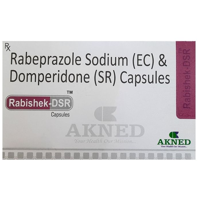 Rabishek-DSR Capsule is a combination medicine used to treat gastroesophageal reflux disease (Acid reflux) and peptic ulcer disease by relieving the symptoms of acidity such as heartburn, stomach pain, or irritation. It also neutralizes the acid and promotes easy passage of gas to reduce stomach discomfort. Rabishek-DSR Capsule is taken without food in a dose and duration as advised by the doctor. The dose you are given will depend on your condition and how you respond to the medicine. You should keep taking this medicine for as long as your doctor recommends. If you stop treatment too early your symptoms may come back and your condition may worsen. Let your healthcare team know about all other medications you are taking as some may affect, or be affected by this medicine. The most common side effects are diarrhea, stomach pain, dryness in mouth, headache, flatulence, and weakness. Most of these are temporary and usually resolve with time. Contact your doctor straight away if you are at all concerned about any of these side effects. This medicine may cause dizziness and sleepiness, so do not drive or do anything that requires mental focus until you know how this medicine affects you. Avoid drinking alcohol while taking this medicine as it can worsen your sleepiness. Lifestyle modifications like having cold milk and avoiding hot tea, coffee, spicy food or chocolate can help you to get better results. Before you start taking this medicine it is important to inform your doctor if you are suffering from kidney or liver disease. You should also tell your doctor if you are pregnant, planning pregnancy or breastfeeding.