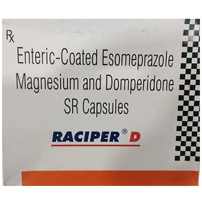 Raciper D 40 Capsule SR is a prescription medicine used to treat gastroesophageal reflux disease (Acid reflux) and indigestion by relieving the symptoms such as heartburn, stomach pain, or irritation. It also neutralizes the acid in the stomach and promotes easy passage of gas to reduce stomach discomfort. Raciper D 40 Capsule SR is taken without food in a dose and duration as advised by the doctor. The dose you are given will depend on your condition and how you respond to the medicine. You should keep taking this medicine for as long as your doctor recommends. If you stop treatment too early your symptoms may come back and your condition may worsen. Let your healthcare team know about all other medications you are taking as some may affect, or be affected by this medicine. Most common side effects are diarrhea, flatulence, stomach pain, dryness in mouth, and headache. Most of these are temporary and usually resolve with time. Contact your doctor straight away if you are at all concerned about any side effects. It may also cause sleepiness and dizziness, so do not drive or do anything that requires mental focus until you know how this medicine affects you. Avoid drinking alcohol while taking this medicine as it can worsen your sleepiness. Lifestyle modifications like having cold milk and avoiding hot tea, coffee, spicy food or chocolate can help you to get better results. Before taking this medicine, you should tell your doctor if you are pregnant, planning pregnancy or breastfeeding. You should also tell your doctor if you have liver diseases so that your doctor can prescribe a suitable dose for you.