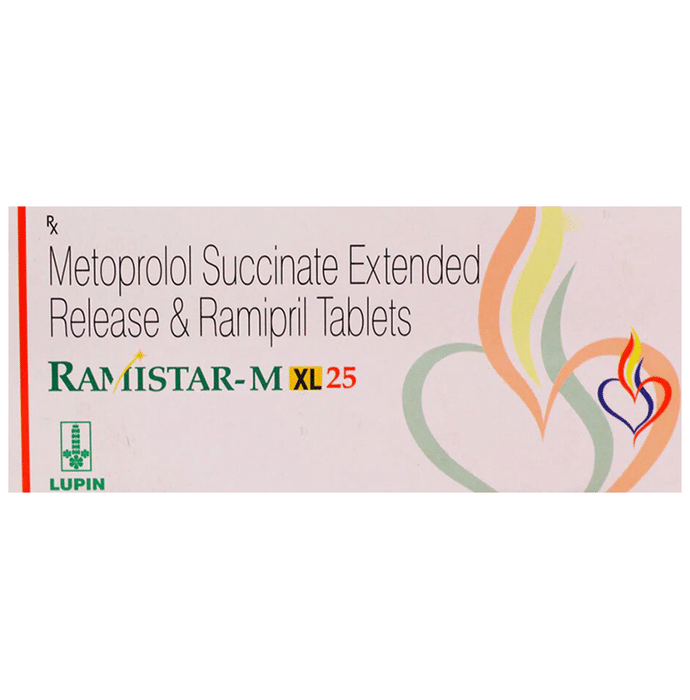 Ramistar-M 25mg/2.5mg Tablet XL is a medicine used for treating high blood pressure. By lowering the blood pressure, it helps in preventing future heart attack and stroke. Early treatment with this medicine also improves chances of survival in patients of heart attack. It is advised to take Ramistar-M 25mg/2.5mg Tablet XL with food at a fixed time each day to maintain consistent levels of medicine in the blood. Keep taking it for as long as advised by your doctor. Even if you feel well, do not stop this medicine on your own because high blood pressure often has no symptoms. If you stop taking it, your condition may get worse. Keeping active with regular exercise, reducing your weight and eating a healthy diet will also help control your blood pressure. Follow your doctor’s advice while taking this medicine. Some common side effects of this medicine include nausea, dry cough, headache, weakness, decreased blood pressure, and increased potassium level in blood. It is advised to avoid potassium rich food and supplements while taking this medicine. It may cause dizziness, avoid driving or rise slowly from the sitting position. You may be asked for regular monitoring of blood pressure, blood sugar level, kidney functioning, urea, or electrolytes level during the treatment. Before taking it, let your doctor know if you have any liver or kidney problems. Pregnant or breastfeeding women should also consult their doctor for advice before taking this medicine. You also need to tell your doctor what other medicines you are taking especially those used to treat high blood pressure or heart conditions.