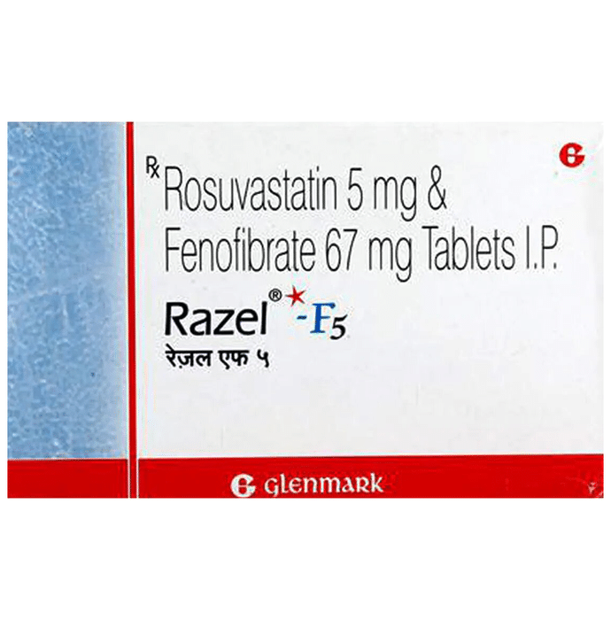 Razel-F5 Tablet is a combination of two lipids (fat) lowering medicines. It is used to lower the levels of lipids known as cholesterol and triglycerides in the blood when lifestyle changes (eg. low-fat diet) on their own have failed. This medicine helps to reduce the risk of heart disease. Razel-F5 Tablet can be taken with a meal or on an empty stomach. You can take it at any time of the day but try to take it at the same time each day. This will help you remember to take it. Your doctor will prescribe the right dose depending on your lipid levels and how you respond to this medicine. Most people with high cholesterol and triglyceride do not feel ill, but stopping your medicine may increase your lipid levels, making your condition worse and increasing your risk of heart disease and stroke. It is important to have your cholesterol and triglyceride levels (lipid profile) checked regularly. This medicine is only one part of a treatment program which should also include a healthy low-fat diet, regular exercise, smoking cessation, moderation of alcohol intake, and weight reduction. You can eat normally while taking this medicine, but try to avoid foods that are high in fat. Nausea, stomach pain, constipation, headache, flatulence (excessive gas), and muscle pain are some of the common side effects of this medicine. These are usually mild and disappear after a short time. Consult your doctor if they persist or if you notice any yellowing of your eyes, unusual bleeding or bruising, or get repeated, severe, or unexplained muscle pains. You may be advised to get your liver function tested periodically while taking this medicine. This medicine should not be used in conditions such as liver disease (eg. abnormal blood tests for liver function, persistent yellowness of eyes, etc.). Before taking it, let your doctor know if you have any kidney-related problems or if you are pregnant, planning a pregnancy, or breastfeeding. Diabetic patients should monitor their blood sugar levels while taking this medicine, as it may lead to an increase in blood sugar levels.