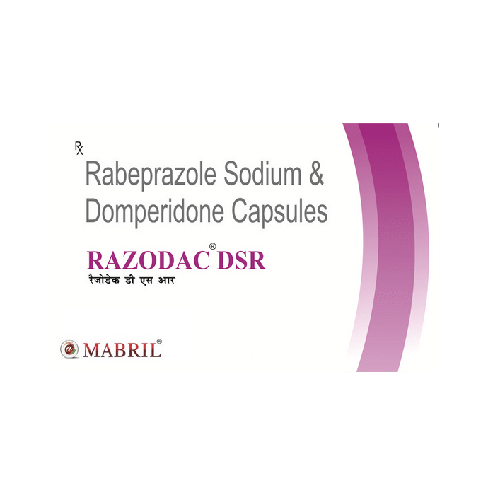 Razodac-DSR Capsule is a combination medicine used to treat gastroesophageal reflux disease (Acid reflux) and peptic ulcer disease by relieving the symptoms of acidity such as heartburn, stomach pain, or irritation. It also neutralizes the acid and promotes easy passage of gas to reduce stomach discomfort. Razodac-DSR Capsule is taken without food in a dose and duration as advised by the doctor. The dose you are given will depend on your condition and how you respond to the medicine. You should keep taking this medicine for as long as your doctor recommends. If you stop treatment too early your symptoms may come back and your condition may worsen. Let your healthcare team know about all other medications you are taking as some may affect, or be affected by this medicine. The most common side effects are diarrhea, stomach pain, dryness in mouth, headache, flatulence, and weakness. Most of these are temporary and usually resolve with time. Contact your doctor straight away if you are at all concerned about any of these side effects. This medicine may cause dizziness and sleepiness, so do not drive or do anything that requires mental focus until you know how this medicine affects you. Avoid drinking alcohol while taking this medicine as it can worsen your sleepiness. Lifestyle modifications like having cold milk and avoiding hot tea, coffee, spicy food or chocolate can help you to get better results. Before you start taking this medicine it is important to inform your doctor if you are suffering from kidney or liver disease. You should also tell your doctor if you are pregnant, planning pregnancy or breastfeeding.