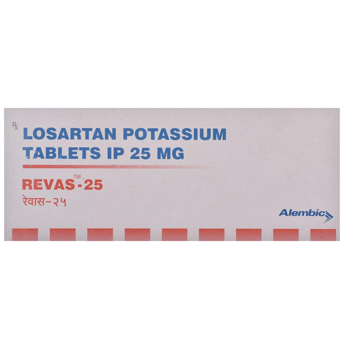 Revas 25 Tablet is a medicine used to treat high blood pressure and heart failure. Lowering blood pressure helps to prevent future heart attacks and stroke. This medicine is also effective in preserving kidney function in patients with diabetes. Revas 25 Tablet can be prescribed either alone or in combination with other medicines. It may be taken with or without food during the day or at night. However, try to take it at the same time each day to get the most benefit. It is important to continue taking it regularly even if you feel well or if your blood pressure is controlled. Most people with high blood pressure do not feel ill, but if you stop taking this medicine, your condition could get worse. This is a widely used medicine and is considered safe for long-term use. Making some changes in your lifestyle will also help lower your blood pressure. These may include regular exercise, losing weight, smoking cessation, reducing alcohol intake, and reducing the amount of salt in your diet as advised by your doctor. This medicine is tolerated well by most patients and has few side effects. Dizziness, particularly after the first dose, is known to occur in some people. This may be associated with headaches. Let your doctor know if these side effects bother you or do not go away. Before taking this medicine, let your doctor know if you have any kidney or liver problems. Pregnant or breastfeeding mothers should also consult their doctor before taking it. Your doctor may check your kidney function, blood pressure, and potassium levels in your blood at regular intervals while you are taking this medicine.