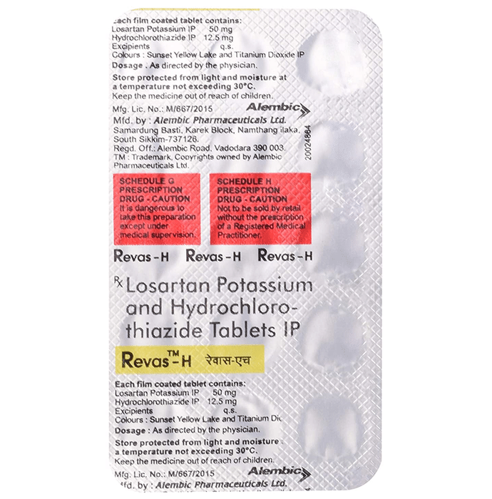 In Treatment of Hypertension (high blood pressure) Revas-H Tablet is a combination of two medicines namely Losartan and Hydrochlorothiazide. It is generally used when one medicine alone is not controlling your blood pressure effectively. Losartan works by relaxing and widening your blood vessels so your blood can flow more easily. This will lower your blood pressure. Hydrochlorothiazide is known as a diuretic (water pill) which increases urine output thereby lowering blood pressure. If your blood pressure is controlled you are less at risk of having a heart attack, stroke, or kidney problems. The medicine must be taken regularly as prescribed to be effective. You do not usually feel any direct benefit from taking this medicine, but it works in the long term to keep you well.