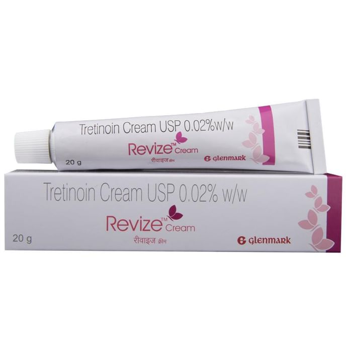 Revize Cream is a form of vitamin A that is used to treat acne which appears as spots or pimples on your face, chest, or back. It also helps to smooth rough facial skin and to reduce fine wrinkles on the skin. Revize Cream reduces excessive oil production of the skin. Ideally, a pinpoint application at nighttime is recommended for the duration prescribed by your doctor. The amount you need and for how long you need to take it will depend on what you are being treated for. You should normally wash and dry the affected area before applying a thin layer of this medicine. Follow your doctor’s instructions. You should not apply it to damaged or broken skin and avoid contact with your mouth, eyes, and nose. It may take several weeks for your symptoms to improve but keep using it regularly to get the most benefit. Consult your doctor again if you do not notice any improvement after a few weeks. Using more medicine or applying it more often than prescribed will not make it work any faster and may increase the side effects. The most common side effects include irritation, dryness, and redness of the skin. They are usually mild and improve as your body gets used to the medicine. Drink plenty of water and use moisturizer as it may lead to dryness of the mouth, lips, and eyes. Let your doctor know if these side effects bother you or do not go away. Serious side effects with this medicine are rare. This medicine may make you more sensitive to sunlight so you should limit exposure to the sun if possible. It may make your skin more fragile. It is advised, not to have any waxing (hair removal), or laser treatments during treatment. Pregnant women or women who are planning to get pregnant should not use this medicine as it can lead to birth defects.