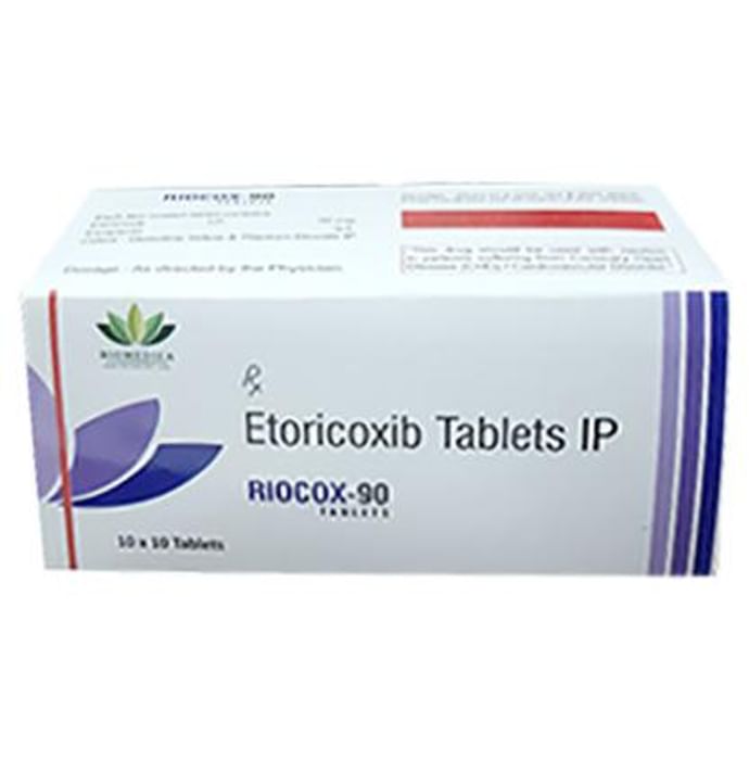Riocox 90 Tablet is a pain-relieving medicine. It is used for relieving moderate pain and swelling of joints associated with different forms of gout and arthritis. It effectively alleviates pain, redness, and swelling. Riocox 90 Tablet should be taken in the dose and duration as advised by your doctor. Riocox 90 Tablet may be taken with or without food, but it is better to take it at a fixed time. The most common side effect of this medicine is abdominal pain. You may also experience other side effects like constipation, flatulence, heartburn, diarrhea, indigestion, nausea, vomiting, esophagitis, oral ulcer, edema, dizziness, headache, palpitations, arrhythmia, high blood pressure, bronchospasm, increased liver enzymes, fatigue, bruises, and flu-like-symptoms. It is potentially unsafe to take it during pregnancy. Inform your doctor if you have a history of stomach ulcers, heart diseases, high blood pressure, and liver or kidney disease.