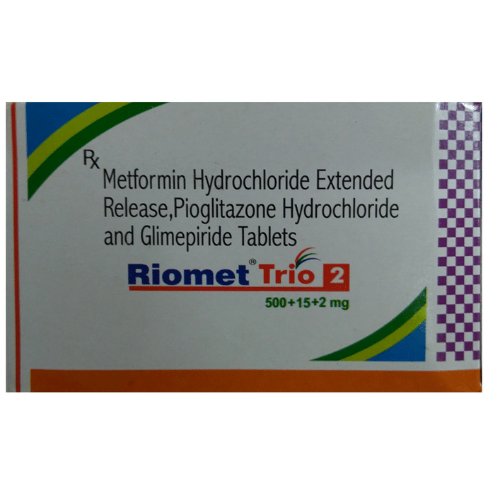 Riomet Trio 2 Tablet ER is a combination medicine that helps control blood sugar levels. This medicine is used together with diet and exercise to improve blood sugar control in adults with type 2 diabetes mellitus. It helps in proper utilisation of insulin, thereby lowering the blood sugar levels. Riomet Trio 2 Tablet ER should be taken in the dose and duration as advised by your doctor. It must be taken with food to avoid stomach upset. If you miss a dose, take it as soon as possible. However, if it is almost time for your next dose, skip the missed dose and go back to your regular schedule. Do not double the dose. Overdose may lead to low blood sugar (hypoglycemia). Some people may develop hypoglycemia (low blood sugar level) when this medicine is taken along with other antidiabetic medicines, alcohol or upon skipping a meal. Monitor your blood sugar levels regularly while taking it. Other common side effects of this medicine include nausea, taste changes, diarrhea, stomach pain, headache, edema (swelling), blurred vision, bone fracture, and respiratory tract infection. Before taking this medicine, inform your doctor if you have any kidney, liver or heart problems. Pregnant or breastfeeding women should also consult their doctor before taking it. Your doctor will check your kidney function tests before starting treatment with it. Avoid excessive alcohol intake while taking it as this may increase the risk of developing some side effects.