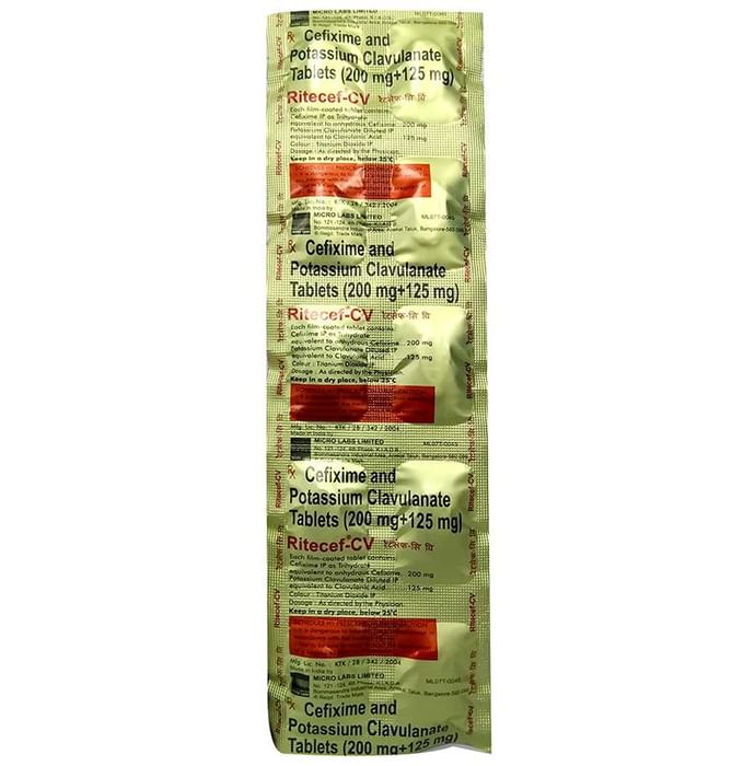 Ritecef-CV Tablet is a combination medicine. It is prescribed to treat various types of bacterial infections. It fights against the microorganisms to prevent their growth and further spread of the infection. Ritecef-CV Tablet is a prescription medicine. It is advised to take it as per the prescription. It can be taken with or without food, but it must be taken at a fixed time to ensure better efficacy. Do not consume more than the recommended dose, as this may have harmful effects on your body. If you miss a dose, take it as soon as you remember. The course of the treatment must be completed even if you feel better. Sudden discontinuation of the treatment may affect the potency of the medicine. Some common side effects of this medicine are nausea, vomiting, diarrhea, indigestion, etc. If any of the side effects get aggravated, you must consult your doctor immediately. If you experience any allergic reaction (rashes, itching, swelling, shortness of breath, etc.), you must seek immediate medical help. Before taking this medicine, you should tell your doctor if you are taking any medicines for any health condition. Pregnant or breastfeeding women should also consult with their doctor before taking it. Avoid drinking alcohol as it can cause excessive drowsiness with this medicine. It usually does not impair your ability to drive, but you should not drive if it makes you feel sleepy or dizzy. You must take adequate rest for a faster recovery, also take a healthy diet and drink plenty of water. Your doctor may ask for a few laboratory and diagnostic tests to know the effects of the medicine on your body.
