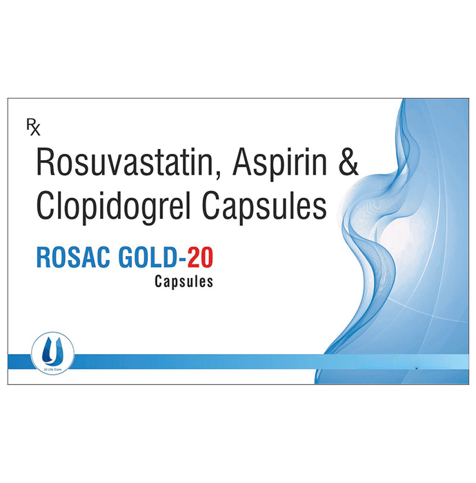 In Heart attack Rosac Gold 20 Capsule is a combination medicine that is used to prevent heart attack. It contains Rosuvastatin that works by reducing the amount of “bad” cholesterol (LDL) and raising the amount of “good” cholesterol (HDL) in your blood. High levels of cholesterol can cause your blood vessels to narrow (atherosclerosis). Lowering the amount of cholesterol reduces the chances of heart diseases and helps you remain healthier for longer. Besides, it also contains two blood thinners, Aspirin and Clopidogrel, that together prevent the formation of blood clots and also prevent the existing ones from growing bigger in size. Take it regularly and make appropriate lifestyle changes (such as eating healthy and staying active) to maximize the effectiveness of this medicine. Keep taking it even if you feel well.