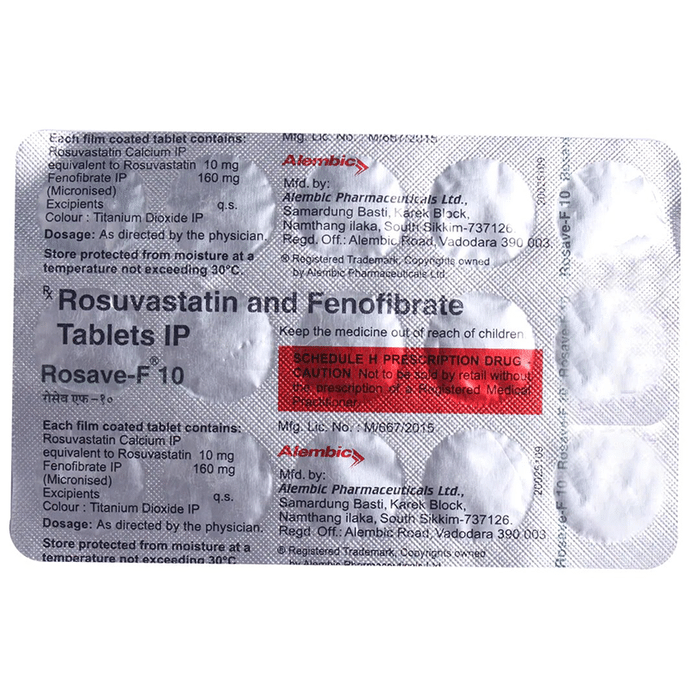 Rosave F 10 Tablet is a combination of two lipids (fat) lowering medicines. It is used to lower the levels of lipids known as cholesterol and triglycerides in the blood when lifestyle changes (eg. low-fat diet) on their own have failed. This medicine helps to reduce the risk of heart disease. Rosave F 10 Tablet can be taken with a meal or on an empty stomach. You can take it at any time of the day but try to take it at the same time each day. This will help you remember to take it. Your doctor will prescribe the right dose depending on your lipid levels and how you respond to this medicine. Most people with high cholesterol and triglyceride do not feel ill, but stopping your medicine may increase your lipid levels, making your condition worse and increasing your risk of heart disease and stroke. It is important to have your cholesterol and triglyceride levels (lipid profile) checked regularly. This medicine is only one part of a treatment program which should also include a healthy low-fat diet, regular exercise, smoking cessation, moderation of alcohol intake, and weight reduction. You can eat normally while taking this medicine, but try to avoid foods that are high in fat. Nausea, stomach pain, constipation, headache, flatulence (excessive gas), and muscle pain are some of the common side effects of this medicine. These are usually mild and disappear after a short time. Consult your doctor if they persist or if you notice any yellowing of your eyes, unusual bleeding or bruising, or get repeated, severe, or unexplained muscle pains. You may be advised to get your liver function tested periodically while taking this medicine. This medicine should not be used in conditions such as liver disease (eg. abnormal blood tests for liver function, persistent yellowness of eyes, etc.). Before taking it, let your doctor know if you have any kidney-related problems or if you are pregnant, planning a pregnancy, or breastfeeding. Diabetic patients should monitor their blood sugar levels while taking this medicine, as it may lead to an increase in blood sugar levels.
