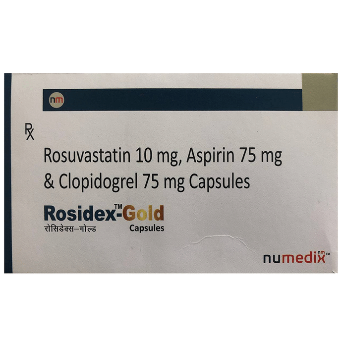 Rosidex-Gold Capsule is used for prevention of heart attack. It is a combination of medicines that prevent clot formation in the blood vessels. It also helps to reduce increased cholesterol and triglycerides levels. Rosidex-Gold Capsule is used for prevention of heart attack. It is a combination of medicines that prevents clot formation in the blood vessels. It also helps to reduce increased cholesterol and triglycerides levels. This medicine should be taken with food regularly at a fixed time each day. This medicine should not be stopped abruptly and taken strictly as advised by the doctor. Lifestyle changes like low-fat diet, exercise, and not smoking may help this medicine work better. This medicine increases your risk of bleeding, so it is important to be careful while shaving, cutting nails, and using sharp objects. Few common side effects of this medicine may include stomach pain, indigestion, diarrhea, and muscle pain.
