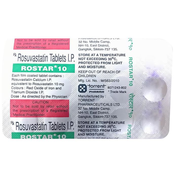 Rostar 10 Tablet belongs to a group of medicines called statins. It is used to lower cholesterol and reduce the risk of heart disease. Cholesterol is a fatty substance that builds up in your blood vessels and causes narrowing, which may lead to a heart attack or stroke. Rostar 10 Tablet is a widely prescribed medicine and is regarded as safe for long-term use. It can be taken with a meal or on an empty stomach. You can take it at any time of the day but try to take it at the same time each day. Most people with high cholesterol do not feel ill, but stopping your medicine may increase your cholesterol levels, making your condition worse and increasing your risk of heart disease and stroke. It is important to have your cholesterol levels checked regularly. This medicine is only one part of the treatment program which should also include a healthy diet, regular exercise, smoking cessation, moderation of alcohol intake, and weight reduction. You can eat normally while taking this medicine, but try to avoid foods that are high in fat. Common side effects of this medicine include muscle pain, weakness, nausea, headache, and stomach pain. These are usually mild and disappear after a short time. Consult your doctor if they persist or if you notice any yellowing of your eyes or get repeated or unexplained muscle pains. This medicine should not be used in conditions such as liver disease. Also, pregnant women and breastfeeding mothers should not take this medicine as it may harm the developing baby. Diabetic patients should monitor their blood sugar levels while taking this medicine, as it may lead to an increase in blood sugar levels.
