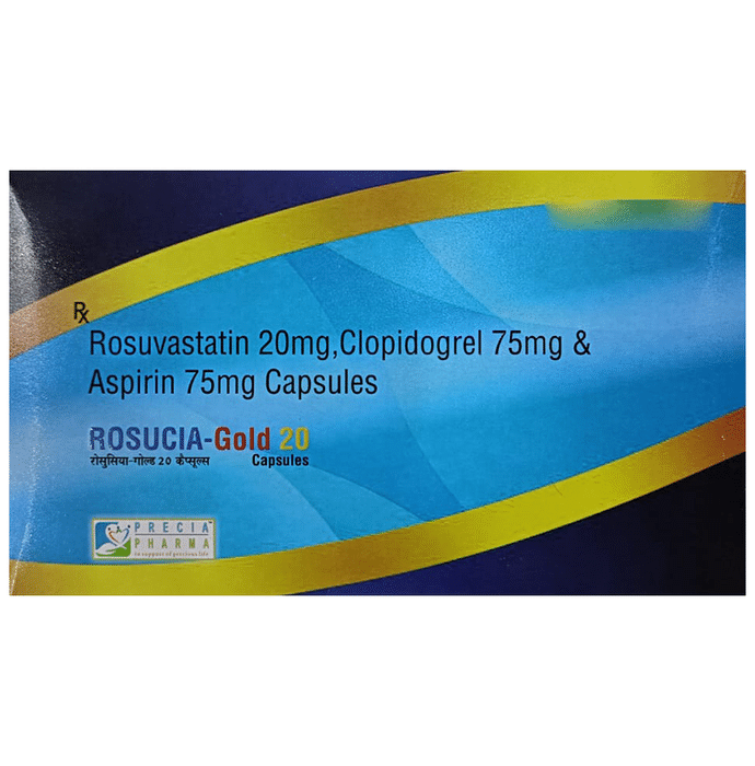 Rosucia-Gold 20 Capsule is used for prevention of heart attack. It is a combination of medicines that prevent clot formation in the blood vessels. It also helps to reduce increased cholesterol and triglycerides levels. Rosucia-Gold 20 Capsule is used for prevention of heart attack. It is a combination of medicines that prevents clot formation in the blood vessels. It also helps to reduce increased cholesterol and triglycerides levels. This medicine should be taken with food regularly at a fixed time each day. This medicine should not be stopped abruptly and taken strictly as advised by the doctor. Lifestyle changes like low-fat diet, exercise, and not smoking may help this medicine work better. This medicine increases your risk of bleeding, so it is important to be careful while shaving, cutting nails, and using sharp objects. Few common side effects of this medicine may include stomach pain, indigestion, diarrhea, and muscle pain.