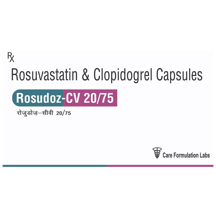Rosudoz-CV 20/75 Tablet is a combination of two medicines used to prevent heart attack and stroke. This medicine reduces the "bad" cholesterol (LDL) and triglycerides (fats) levels. Moreover, it also decreases the formation of harmful blood clots. Rosudoz-CV 20/75 Tablet should be taken with or without food. You should take it regularly at evenly spaced intervals as per the schedule prescribed by your doctor. Taking it at the same time every day will help you remember to take it. The dose and duration of treatment will depend on what you are being treated for. Do not stop taking it until you have finished the complete course, even when you feel better. Lifestyle changes like low-fat diet, exercise and not smoking may help this medicine to work better. Stomach pain, diarrhea, indigestion, constipation, and headache are some common side effects of this medicine. This medicine increases your risk of bleeding, so it is important to be careful while shaving, cutting nails, using sharp objects, or engaging in contact sports (e.g., football, wrestling). Let your doctor know if you notice yellowing of skin, muscle pain or dark urine. You may be asked for regular monitoring of liver function while taking this medicine. Before taking this medicine, tell your doctor if you have liver or kidney disease or you are suffering from bleeding disorder. You must tell your doctor if you are pregnant, planning pregnancy or breastfeeding. You should also let your healthcare team know all other medicines you are taking as they may affect, or be affected by this medicine.
