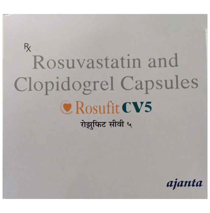 Rosufit CV 5 Capsule is a combination of two medicines used to prevent heart attack and stroke. This medicine reduces the "bad" cholesterol (LDL) and triglycerides (fats) levels. Moreover, it also decreases the formation of harmful blood clots. Rosufit CV 5 Capsule should be taken with or without food. You should take it regularly at evenly spaced intervals as per the schedule prescribed by your doctor. Taking it at the same time every day will help you remember to take it. The dose and duration of treatment will depend on what you are being treated for. Do not stop taking it until you have finished the complete course, even when you feel better. Lifestyle changes like low-fat diet, exercise and not smoking may help this medicine to work better. Stomach pain, diarrhea, indigestion, constipation, and headache are some common side effects of this medicine. This medicine increases your risk of bleeding, so it is important to be careful while shaving, cutting nails, using sharp objects, or engaging in contact sports (e.g., football, wrestling). Let your doctor know if you notice yellowing of skin, muscle pain or dark urine. You may be asked for regular monitoring of liver function while taking this medicine. Before taking this medicine, tell your doctor if you have liver or kidney disease or you are suffering from bleeding disorder. You must tell your doctor if you are pregnant, planning pregnancy or breastfeeding. You should also let your healthcare team know all other medicines you are taking as they may affect, or be affected by this medicine.