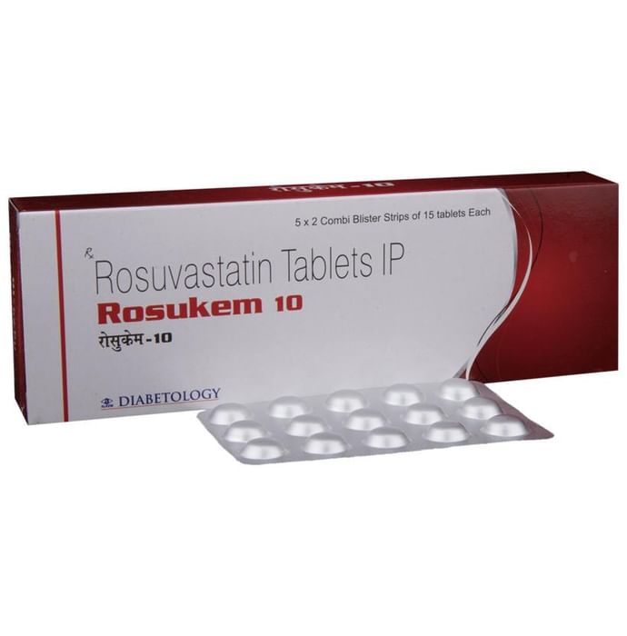 Rosukem 10 Tablet belongs to a group of medicines called statins. It is used to lower cholesterol and reduce the risk of heart disease. Cholesterol is a fatty substance that builds up in your blood vessels and causes narrowing, which may lead to a heart attack or stroke. Rosukem 10 Tablet is a widely prescribed medicine and is regarded as safe for long-term use. It can be taken with a meal or on an empty stomach. You can take it at any time of the day but try to take it at the same time each day. Most people with high cholesterol do not feel ill, but stopping your medicine may increase your cholesterol levels, making your condition worse and increasing your risk of heart disease and stroke. It is important to have your cholesterol levels checked regularly. This medicine is only one part of the treatment program which should also include a healthy diet, regular exercise, smoking cessation, moderation of alcohol intake, and weight reduction. You can eat normally while taking this medicine, but try to avoid foods that are high in fat. Common side effects of this medicine include muscle pain, weakness, nausea, headache, and stomach pain. These are usually mild and disappear after a short time. Consult your doctor if they persist or if you notice any yellowing of your eyes or get repeated or unexplained muscle pains. This medicine should not be used in conditions such as liver disease. Also, pregnant women and breastfeeding mothers should not take this medicine as it may harm the developing baby. Diabetic patients should monitor their blood sugar levels while taking this medicine, as it may lead to an increase in blood sugar levels.