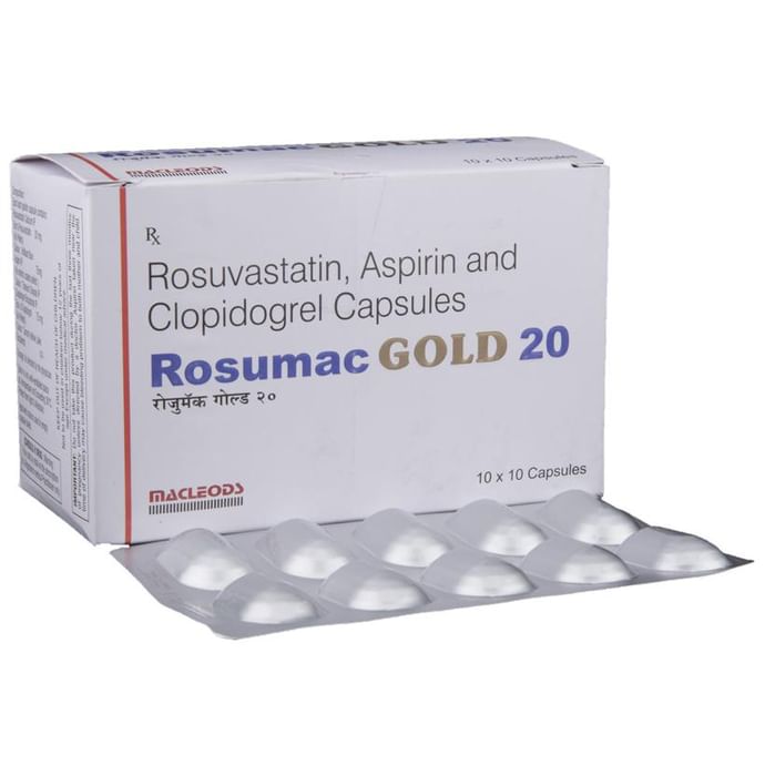 Rosumac Gold 20 Capsule is used for prevention of heart attack. It is a combination of medicines that prevent clot formation in the blood vessels. It also helps to reduce increased cholesterol and triglycerides levels. Rosumac Gold 20 Capsule is used for prevention of heart attack. It is a combination of medicines that prevents clot formation in the blood vessels. It also helps to reduce increased cholesterol and triglycerides levels. This medicine should be taken with food regularly at a fixed time each day. This medicine should not be stopped abruptly and taken strictly as advised by the doctor. Lifestyle changes like low-fat diet, exercise, and not smoking may help this medicine work better. This medicine increases your risk of bleeding, so it is important to be careful while shaving, cutting nails, and using sharp objects. Few common side effects of this medicine may include stomach pain, indigestion, diarrhea, and muscle pain.