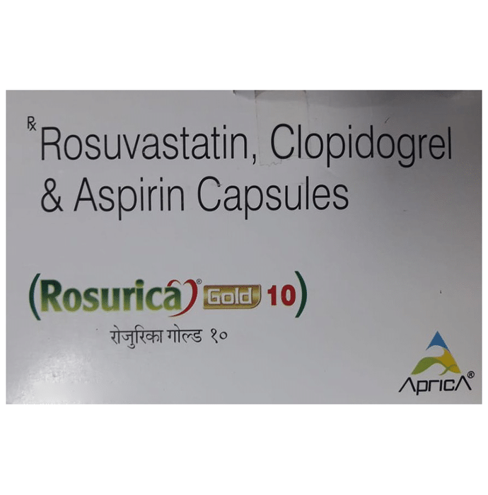 Rosurica Gold 10mg Capsule is used for prevention of heart attack. It is a combination of medicines that prevent clot formation in the blood vessels. It also helps to reduce increased cholesterol and triglycerides levels. Rosurica Gold 10mg Capsule is used for prevention of heart attack. It is a combination of medicines that prevents clot formation in the blood vessels. It also helps to reduce increased cholesterol and triglycerides levels. This medicine should be taken with food regularly at a fixed time each day. This medicine should not be stopped abruptly and taken strictly as advised by the doctor. Lifestyle changes like low-fat diet, exercise, and not smoking may help this medicine work better. This medicine increases your risk of bleeding, so it is important to be careful while shaving, cutting nails, and using sharp objects. Few common side effects of this medicine may include stomach pain, indigestion, diarrhea, and muscle pain.
