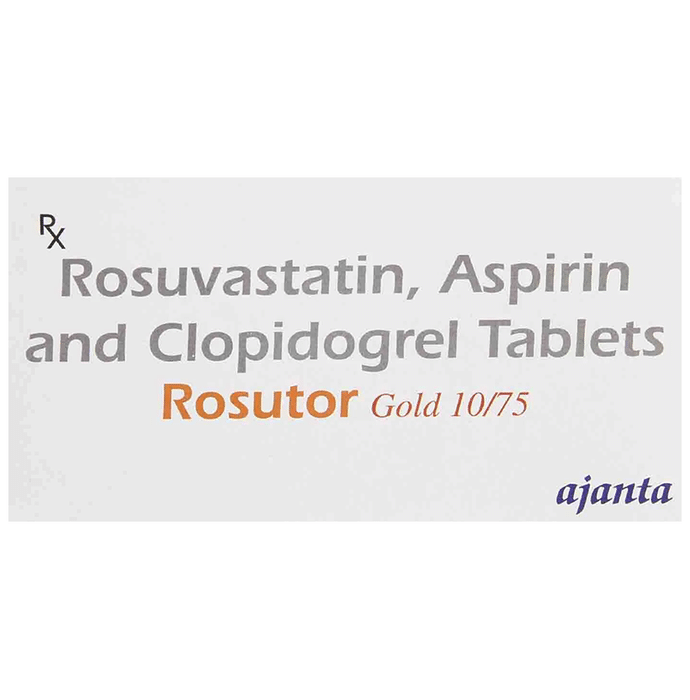Rosutor Gold 10/75 Tablet is used for prevention of heart attack. It is a combination of medicines that prevent clot formation in the blood vessels. It also helps to reduce increased cholesterol and triglycerides levels. Rosutor Gold 10/75 Tablet is used for prevention of heart attack. It is a combination of medicines that prevents clot formation in the blood vessels. It also helps to reduce increased cholesterol and triglycerides levels. This medicine should be taken with food regularly at a fixed time each day. This medicine should not be stopped abruptly and taken strictly as advised by the doctor. Lifestyle changes like low-fat diet, exercise, and not smoking may help this medicine work better. This medicine increases your risk of bleeding, so it is important to be careful while shaving, cutting nails, and using sharp objects. Few common side effects of this medicine may include stomach pain, indigestion, diarrhea, and muscle pain.