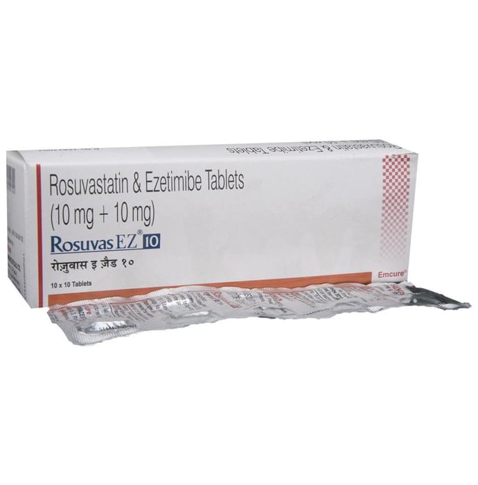 Rosuvas EZ 10 Tablet is a medicine used to treat high cholesterol. This is a combination medicine that reduces "bad" cholesterol (LDL) and triglycerides (fats) levels. It also helps to reduce risk of future heart attack and stroke. Rosuvas EZ 10 Tablet can be taken with or without food. You should take it regularly at evenly spaced intervals as per the schedule prescribed by your doctor. Taking it at the same time every day will help you remember to take it. The dose and duration of treatment will depend on what you are being treated for. Do not stop taking it until you have finished the complete course, even when you feel better. You can help this medicine work better by making a few changes to your lifestyle such as keeping active, stopping smoking, eating a healthy low-fat diet and exercise regularly. Headache, weakness, muscle pain and back pain are some common side effects of this medicine. These are usually mild but let your doctor know if they bother you or last more than a few days. Let your doctor know if you notice yellowing of skin or eyes, unusually dark urine or dark stools as it might be symptoms of liver damage. You may be asked for regular monitoring of blood sugar level, and liver function while taking this medicine. Before taking this medicine, let your doctor know if you have any kidney or liver problems or high blood pressure. Pregnant or breastfeeding women should also consult their doctor before taking it. You should also let your healthcare team know all other medicines you are taking as they may affect, or be affected by this medicine.