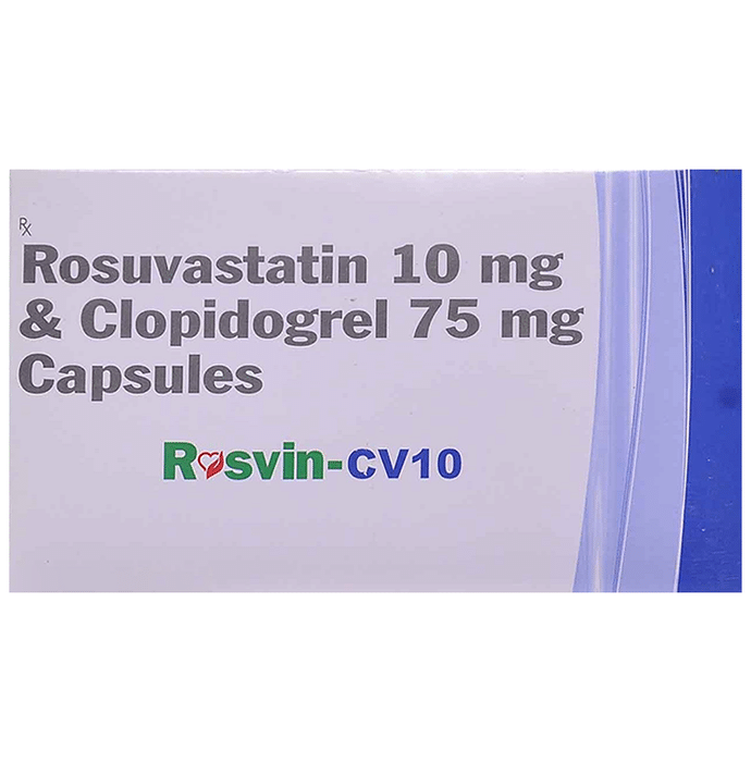 Rosvin-CV 10 Capsule is a combination of two medicines used to prevent heart attack and stroke. This medicine reduces the "bad" cholesterol (LDL) and triglycerides (fats) levels. Moreover, it also decreases the formation of harmful blood clots. Rosvin-CV 10 Capsule should be taken with or without food. You should take it regularly at evenly spaced intervals as per the schedule prescribed by your doctor. Taking it at the same time every day will help you remember to take it. The dose and duration of treatment will depend on what you are being treated for. Do not stop taking it until you have finished the complete course, even when you feel better. Lifestyle changes like low-fat diet, exercise and not smoking may help this medicine to work better. Stomach pain, diarrhea, indigestion, constipation, and headache are some common side effects of this medicine. This medicine increases your risk of bleeding, so it is important to be careful while shaving, cutting nails, using sharp objects, or engaging in contact sports (e.g., football, wrestling). Let your doctor know if you notice yellowing of skin, muscle pain or dark urine. You may be asked for regular monitoring of liver function while taking this medicine. Before taking this medicine, tell your doctor if you have liver or kidney disease or you are suffering from bleeding disorder. You must tell your doctor if you are pregnant, planning pregnancy or breastfeeding. You should also let your healthcare team know all other medicines you are taking as they may affect, or be affected by this medicine.