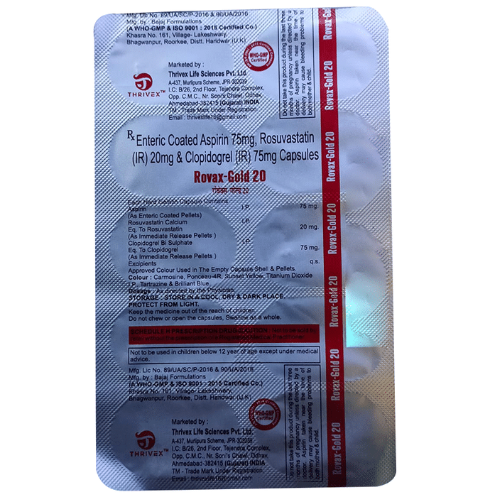 In Prevention of Angina (heart-related chest pain) Rovax-Gold 20 Capsule IR works as a blood thinner and is used in small doses to reduce the risk of blood clots forming. It prevents platelets from sticking together thereby preventing the formation of harmful blood clots. This means you are less likely to suffer from angina, a heart attack, a stroke, or other blockages of blood vessels. It is likely to be prescribed if you have a high risk of cardiovascular disease and should be taken regularly (usually for the rest of your life) to have a preventive effect. In Treatment and prevention of Heart attack Rovax-Gold 20 Capsule IR prevents the formation of blood clots in blood vessels thereby reducing the risk of future heart attacks or strokes. In larger doses, Rovax-Gold 20 Capsule IR may be used in the treatment of a heart attack or a stroke that has been caused by a blood clot. It stops the blood clot that is blocking the supply of blood to the heart from growing any bigger.
