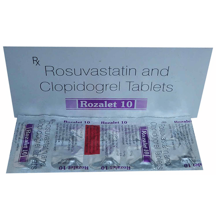 In Heart attack prevention and high cholesterol Rozalet 10 Tablet is a combination medicine that is used to prevent heart attack. It contains Rosuvastatin that works by reducing the amount of “bad” cholesterol (LDL) and raising the amount of “good” cholesterol (HDL) in your blood. High levels of cholesterol can cause your blood vessels to narrow (atherosclerosis). Lowering the amount of cholesterol reduces the chances of heart diseases and helps you remain healthier for longer. Besides, it also contains a blood thinner, Clopidogrel, that prevents the formation of blood clots and also prevents the existing ones from growing bigger in size. Take it regularly and make appropriate lifestyle changes (such as eating healthy and staying active) to maximize the effectiveness of this medicine. Keep taking it even if you feel well.
