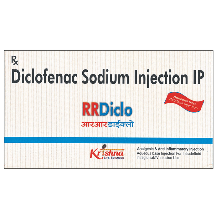 RRDiclo Injection is a pain-relieving medicine. It is used to treat pain, swelling, stiffness, and joint pain in conditions like rheumatoid arthritis, osteoarthritis, and acute musculoskeletal injuries. It is given in cases where oral administration is not possible. RRDiclo Injection is administered as an injection by a healthcare professional. Kindly do not self administer. Inform your doctor if you have any history of heart disease or stroke. Please consult your doctor in case any injection site reactions like pain, swelling, or redness are observed. The most common side effects of this medicine include nausea, limb discomfort, and injection site reactions. Your doctor may regularly monitor your kidney function, liver function, and levels of blood components if you are taking this medicine for long-term treatment. Long term use may lead to serious complications such as stomach bleeding and kidney problems.
