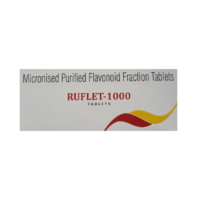 Ruflet 1000 Tablet is used in the treatment of acute or chronic hemorrhoids, varicose veins, and lymphedema. It improves blood flow in the veins and restores its function. Ruflet 1000 Tablet is taken with or without food in a dose and duration as advised by the doctor. You should keep taking this medicine for as long as your doctor recommends. If you stop treatment too early your symptoms may come back and your condition may worsen. Let your doctor know about all other medications you are taking as some may affect, or be affected by this medicine. The most common side effects are abdominal pain, headache, nausea, and diarrhea. Most of these are temporary and usually resolve with time. Contact your doctor straight away if you are at all concerned about any of these side effects. This medicine may also cause diarrhea, so it is better to take plenty of fluids while taking this medicine as it may help to prevent dehydration. Lifestyle modifications like reducing smoking, increasing exercise, and a healthy diet will help you to get better results. Pregnant or breastfeeding women should consult their doctor before taking this medicine. You should let your doctor know if you have liver or kidney heart problems.