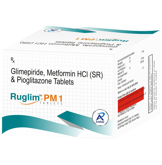 Ruglim PM 1 Tablet SR is a combination medicine that helps control blood sugar levels. This medicine is used together with diet and exercise to improve blood sugar control in adults with type 2 diabetes mellitus. It helps in proper utilisation of insulin, thereby lowering the blood sugar levels. Ruglim PM 1 Tablet SR should be taken in the dose and duration as advised by your doctor. It must be taken with food to avoid stomach upset. If you miss a dose, take it as soon as possible. However, if it is almost time for your next dose, skip the missed dose and go back to your regular schedule. Do not double the dose. Overdose may lead to low blood sugar (hypoglycemia). Some people may develop hypoglycemia (low blood sugar level) when this medicine is taken along with other antidiabetic medicines, alcohol or upon skipping a meal. Monitor your blood sugar levels regularly while taking it. Other common side effects of this medicine include nausea, taste changes, diarrhea, stomach pain, headache, edema (swelling), blurred vision, bone fracture, and respiratory tract infection. Before taking this medicine, inform your doctor if you have any kidney, liver or heart problems. Pregnant or breastfeeding women should also consult their doctor before taking it. Your doctor will check your kidney function tests before starting treatment with it. Avoid excessive alcohol intake while taking it as this may increase the risk of developing some side effects.
