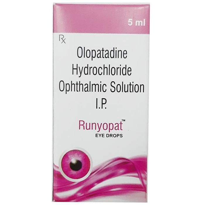 Runyopat Eye Drop belongs to a group of medicines called antihistamines. It is used to treat seasonal allergic conjunctivitis (infection, itching, redness, and swelling of the eye) caused due to pollens, dust, animal fur, and other allergens. Follow your doctor’s instructions precisely for using Runyopat Eye Drop in your eyes. It should be used regularly at evenly spaced time intervals as prescribed by your doctor. Do not skip any doses and finish the full course of treatment even if you feel better. It may also lead to burning, pain, irritation in your eyes but this effect is temporary.