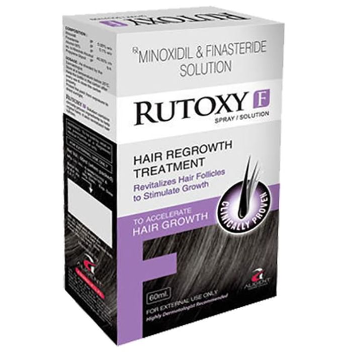 Rutoxy F Hair Growth Spray is a combination medicine used in the treatment of hair loss in men. It works by increasing blood flow to the hair follicles which further prevents hair loss and stimulates re-growth resulting in longer, thicker and increased numbers of hair. Use Rutoxy F Hair Growth Spray in the dose and duration as prescribed by your doctor or as instructed in the label. Clean and dry your scalp before using it. It may take several months before you notice any hair growth. The first growth could be soft, colorless, and barely visible. Use it in the exact dose and duration as prescribed by your doctor. Using more than recommended will not speed up hair growth and may increase the likelihood of side effects. Use it for as long as the doctor has prescribed to maintain proper hair growth. If your condition does not improve after using it for 4 to 6 months, tell your doctor. This medicine is to be used only by men and not indicated in women. It is generally safe, however, it may cause few common side effects such as application site reactions, dry skin, impotence, decreased libido, ejaculation disorders, breast enlargement, breast tenderness in males, and skin rash. In case of accidental contact with other parts of the body, it may cause excessive hair growth. If you get it in your eyes, mouth, or broken skin, rinse thoroughly with plenty of water. Talk to your doctor if you are bothered by side effects or they do not go away. To ensure its safety, before using this medicine, let your doctor know if you have any problems with your heart. Additionally, inform your doctor about all the medicines you are taking. Pregnant, potentially pregnant, or breastfeeding women should not handle this medicine because of the possibility of absorption of finasteride. As it may cause potential harm to a male baby or fetus.