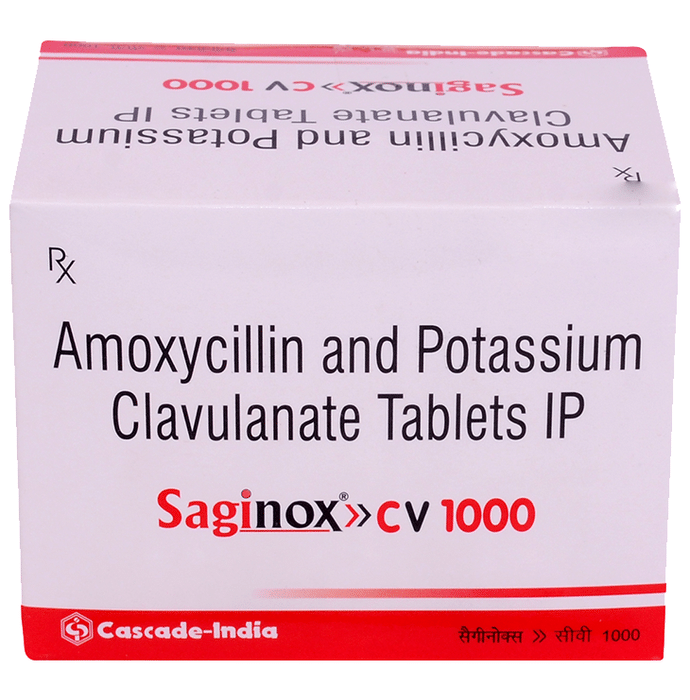 Saginox CV 1000 Tablet is a penicillin-type of antibiotic that helps your body fight infections caused by bacteria. It is used to treat infections of the lungs (e.g., pneumonia), ear, nasal sinus, urinary tract, skin, and soft tissue. It will not work for viral infections such as the common cold. Saginox CV 1000 Tablet is best taken with a meal to reduce the chance of a stomach upset. You should take it regularly at evenly spaced intervals as per the schedule prescribed by your doctor. Taking it at the same time every day will help you to remember to take it. The dose will depend on what you are being treated for, but you should always complete a full course of this antibiotic as prescribed by your doctor. Do not stop taking it until you have finished, even when you feel better. If you stop taking it early, some bacteria may survive and the infection may come back or worsen. The most common side effects of this medicine include vomiting, nausea, and diarrhea. These are usually mild but let your doctor know if they bother you or will not go away. Before taking it, let your doctor know if you are allergic to any antibiotics or have any kidney or liver problems. You should also let your healthcare team know about all other medicines you are taking as they may affect, or be affected by, this medicine. This medicine is generally regarded as safe to use during pregnancy and breastfeeding if prescribed by a doctor.