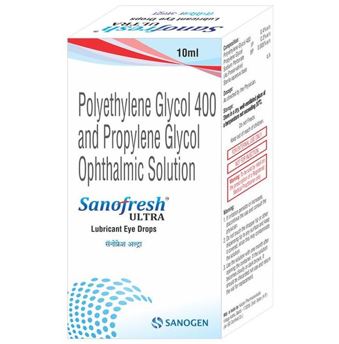 Sanofresh Ultra Eye Drop is a prescription medicine used to treat symptoms of dry eyes. It lubricates the eyes. This way it provides temporary relief from burning and discomfort caused by dry eyes. It also reduces redness and swelling of the eye. Sanofresh Ultra Eye Drop is to be used only in the affected eye in the dose and duration as advised by the doctor. Wash your hands before using this medicine. It is advised to check the label for directions before use. Do not use it too much or too little than the prescribed amount. Use it in the exact dose and duration as advised by the doctor. Use of this medicine may cause itching, irritation, and stinging sensation at the application site. These are usually temporary and resolve with time. However, if they persist or get worse, inform your doctor. In case of accidental contact with your ears, nose, or mouth, immediately rinse it with water. Inform your doctor if you have a known allergy to any of the ingredients in this medicine or if you are taking any other medication. It is advised not to drive or operate heavy machinery immediately after using this medicine as it may cause temporary blurring of vision and may affect your ability to drive.